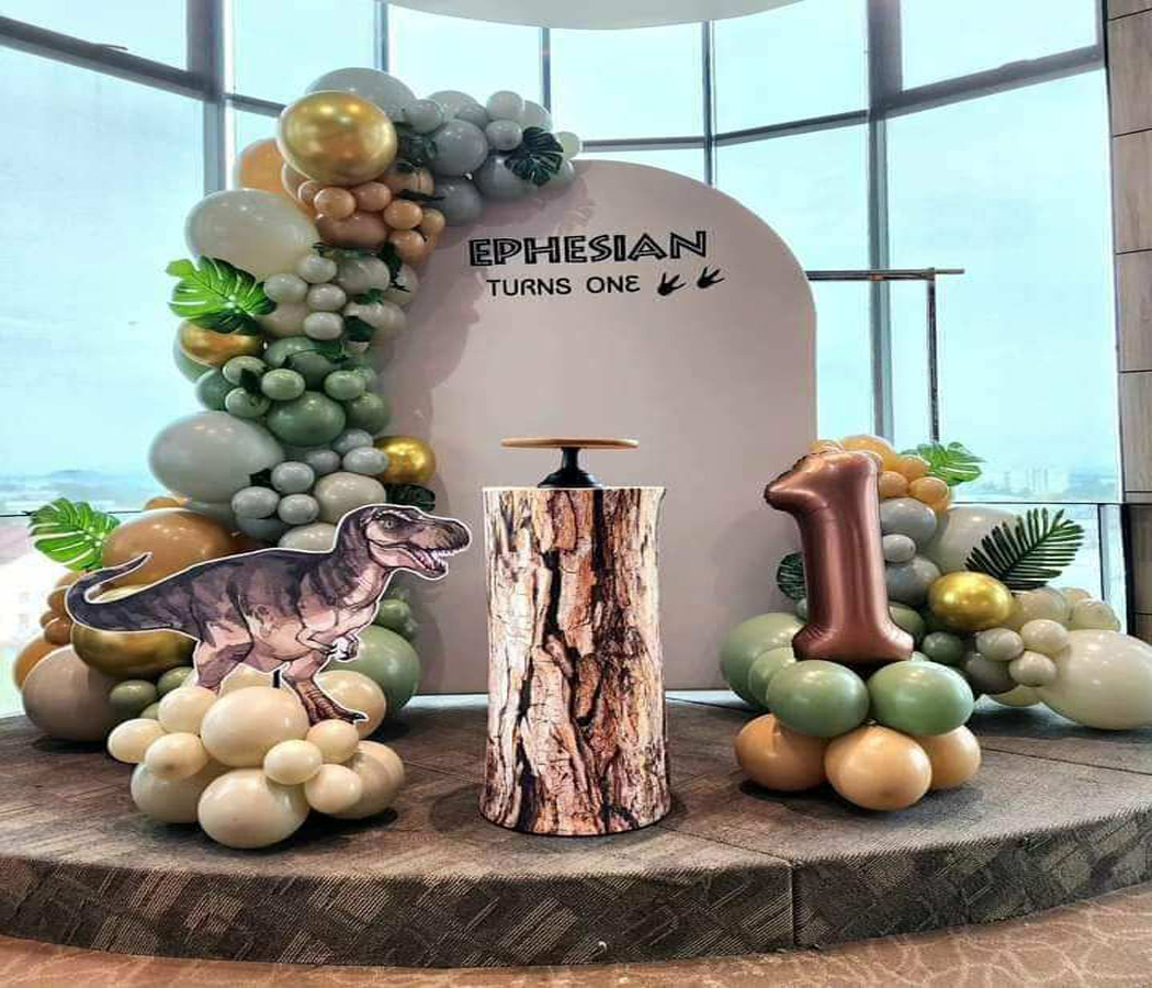 Artificial Leaves: Small pieces of artificial foliage (resembling palm or monstera leaves) made of fabric or plastic are tucked into the balloon garlands to enhance the “safari” or “dinosaur” theme.