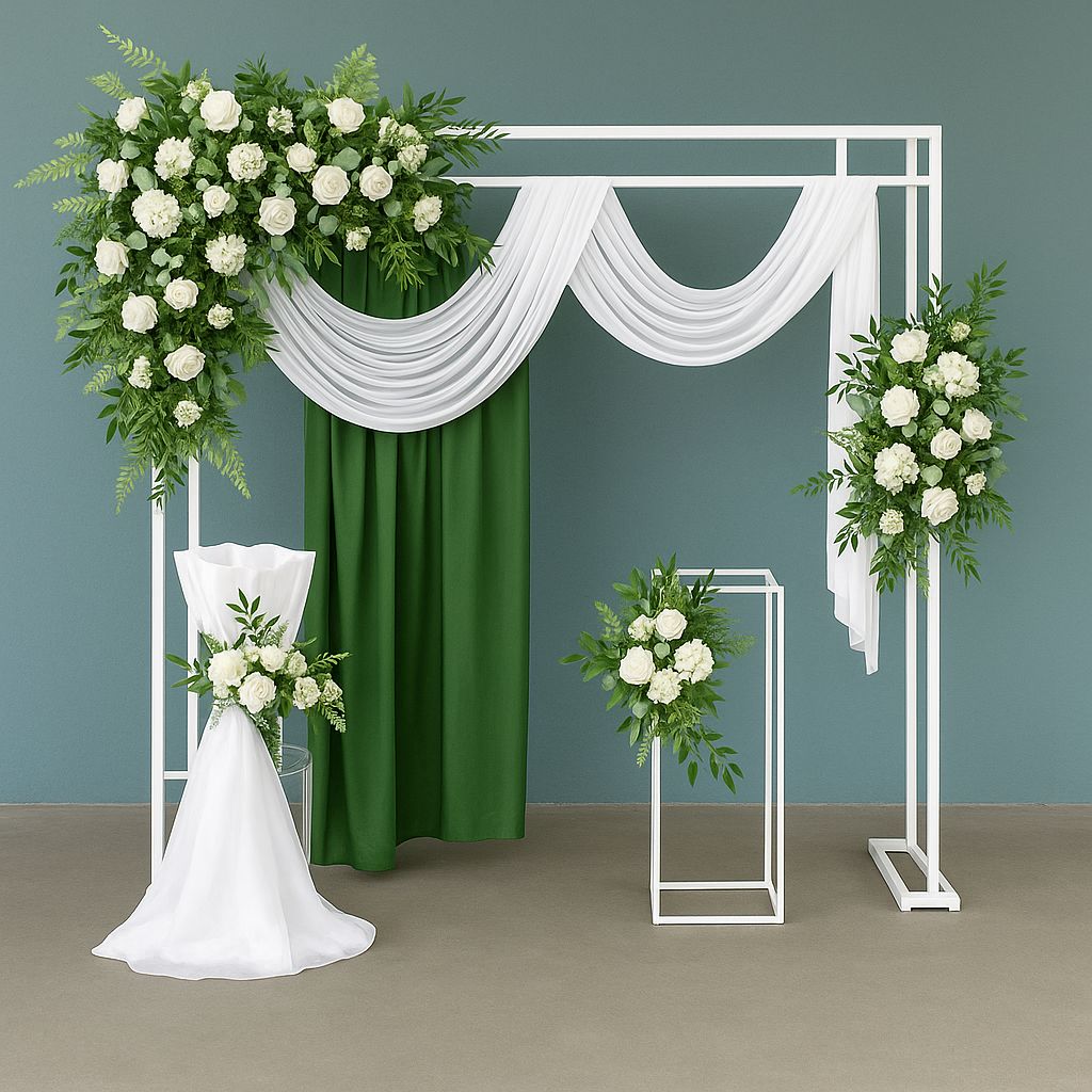 - Green Curtain Backdrop: Made from polyester or satin, providing contrast and depth behind the arch.