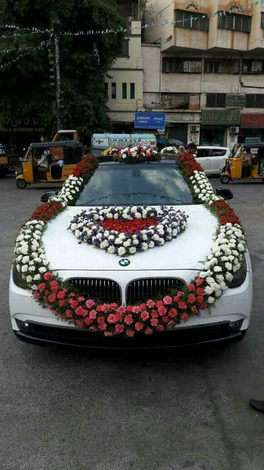 The white BMW in the image is decorated with a luxurious and symmetrical floral setup, ideal for weddings or high-profile celebrations. Here’s a detailed breakdown of the materials likely used: