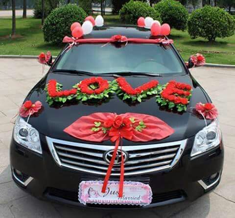 The black car in the image is decorated with a festive and romantic wedding theme. Here’s a detailed breakdown of the materials used: