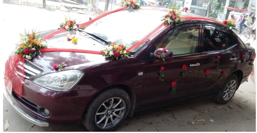 - Red, Yellow, White, and Orange Fresh Flowers: These appear to be roses, marigolds, and chrysanthemums, arranged on the hood, roof, doors, and side mirrors. They add vibrancy and cultural richness.