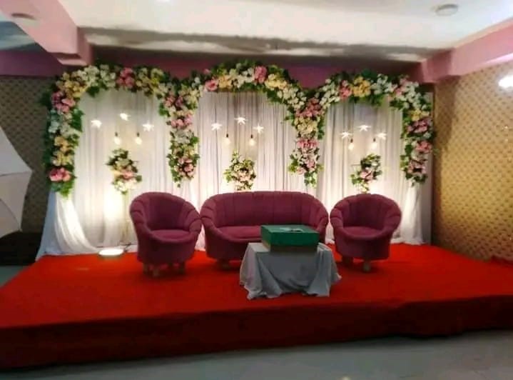 - Backdrop Frame: Likely made of metal or PVC pipes to support the drapes and floral arrangements.