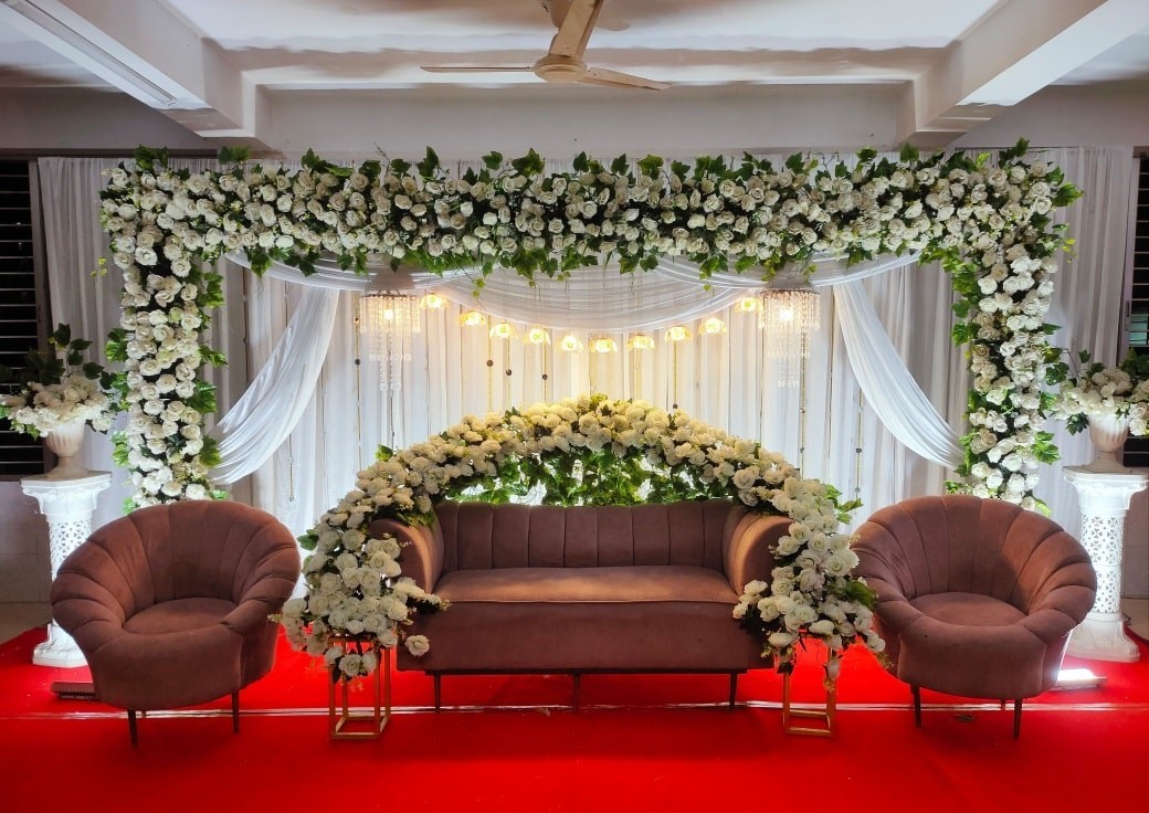 - Backdrop Frame: Metal or PVC pipe frame to support drapes and floral arch.